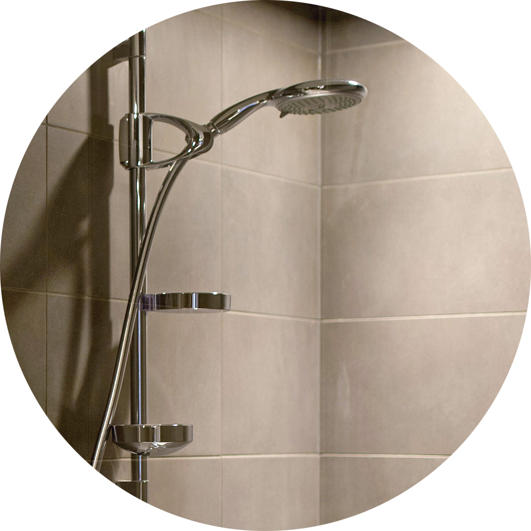 The bathroom tiles are solid-dyed glazed stoneware and come in a choice of three different colours.